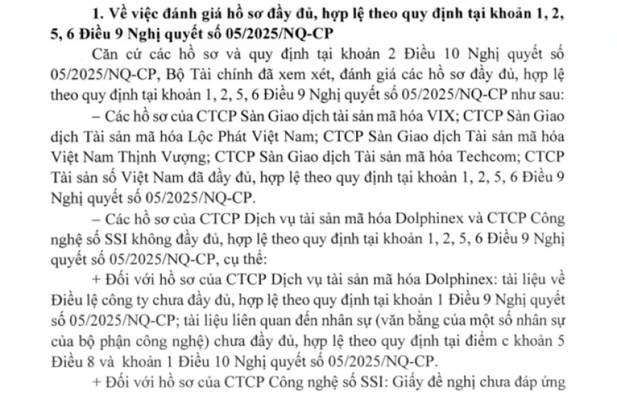 Bộ Tài chính đã xem xét, đánh giá có 5 hồ sơ đầy đủ, hợp lệ theo quy định bao gồm: Hồ sơ của Công ty CP Sàn Giao dịch tài sản mã hóa VIX; Công ty CP Sàn Giao dịch Tài sản mã hóa Lộc Phát Việt Nam; Công ty CP Sàn Giao dịch Tài sản mã hóa Việt Nam Thịnh Vượng; Công ty CP Sàn Giao dịch Tài sản mã hóa Techcom; Công ty СР Tài sản số Việt Nam.
