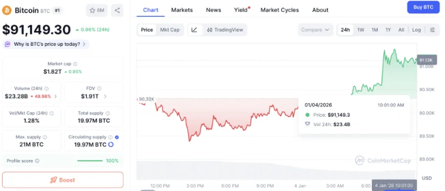 Tính đến 15 giờ ngày 4/1, giá BTC hiện đang được giao dịch quanh giá 91.500 USD. Trước đó, khoảng 7 giờ sáng cùng ngày, đồng tiền điện tử này đã chính thức vượt ngưỡng 91.000 USD.