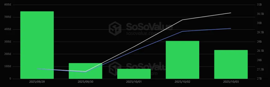 Thị trường các quỹ hoán đổi danh mục tài sản mã hóa khởi động tháng 10 với chuỗi tăng trưởng ấn tượng khi các nhà đầu tư tổ chức gia tăng mạnh mẽ mức độ phơi nhiễm với tài sản số. Tuần giao dịch từ ngày 29 tháng 9 đến 3 tháng 10 chứng kiến các quỹ ETF Bitcoin thu hút 3,24 tỷ USD, trong khi các quỹ ETF Ether ghi nhận thêm 1,3 tỷ USD dòng vốn vào, phản ánh sự chuyển biến tích cực trong tâm lý thị trường sau giai đoạn biến động.