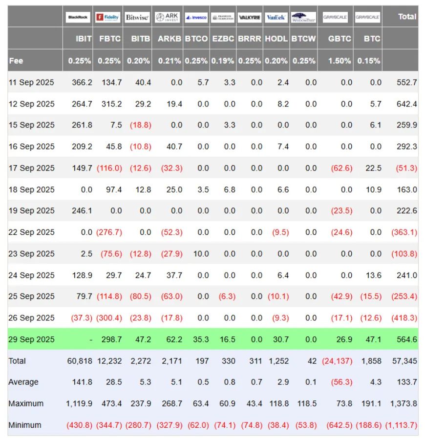 Tuy nhiên, đến ngày 29.9, xu hướng đảo chiều rõ rệt khi dòng tiền quay trở lại mạnh mẽ với mức 564,6 triệu USD. Điều này trùng hợp với đà phục hồi của Bitcoin lên trên 114.500 USD, cho thấy ETF tiếp tục là động lực chính hỗ trợ giá.