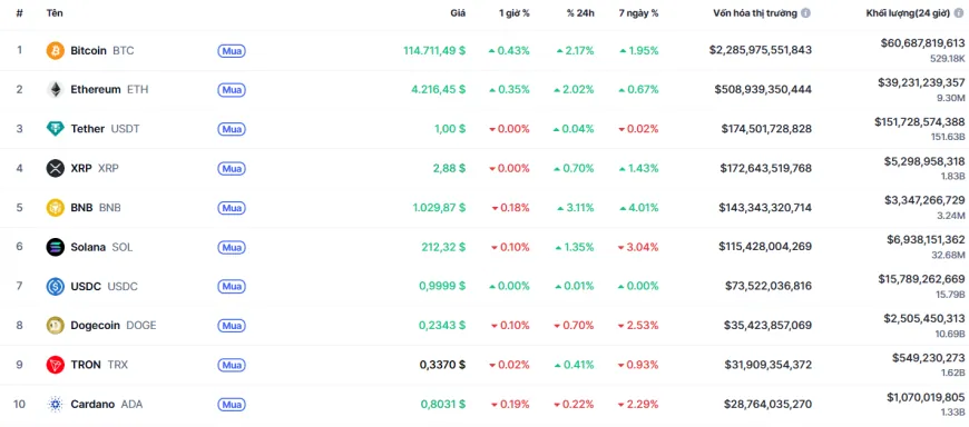 Tính đến sáng 30.9, giá Bitcoin (BTC) ghi nhận quanh 114.705 USD, tăng 2,15% trong 24 giờ qua.