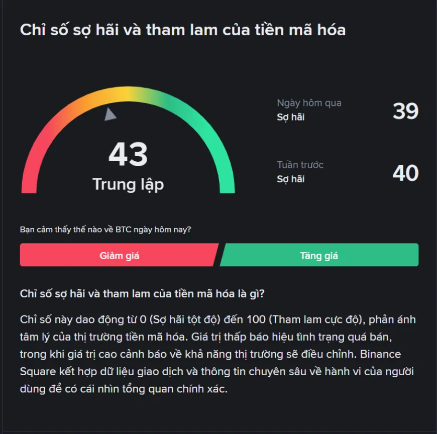 Dựa trên dữ liệu từ Binance, chỉ số “sợ hãi” và “tham lam” (Fear & Greed Index) cho thị trường tiền mã hóa (chủ yếu dựa trên Bitcoin và các đồng coin lớn) hiện ở mức 43 được phân loại là trung lập (Neutral).