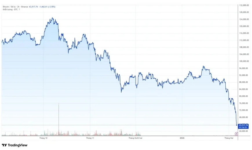 Dữ liệu từ Coinmarketcap cho thấy vào rạng sáng ngày 6/2 (giờ Việt Nam), giá Bitcoin đã giảm hơn 13% so với một ngày trước đó và giao dịch quanh vùng 63.000 USD/BTC.