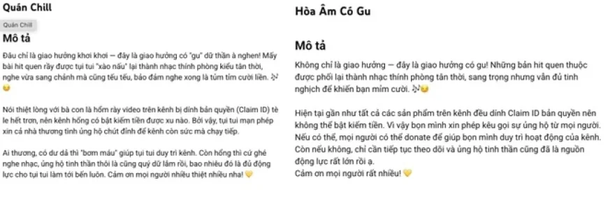 Trong phần mô tả của hai kênh, các admin đều ghi rõ hầu hết sản phẩm đều dính Claim ID bản quyền nên không thể bật kiếm tiền. Anh Toàn giải thích rằng phần lớn số tiền sẽ được chia cho chủ sở hữu bản quyền bài nhạc gốc.