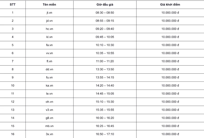 VNNIC cho biết giá khởi điểm đấu giá là 10.000.000 đồng/tên miền, chưa bao gồm thuế giá trị gia tăng, các loại thuế, phí, lệ phí theo quy định và các chi phí phát sinh liên quan (nếu có).