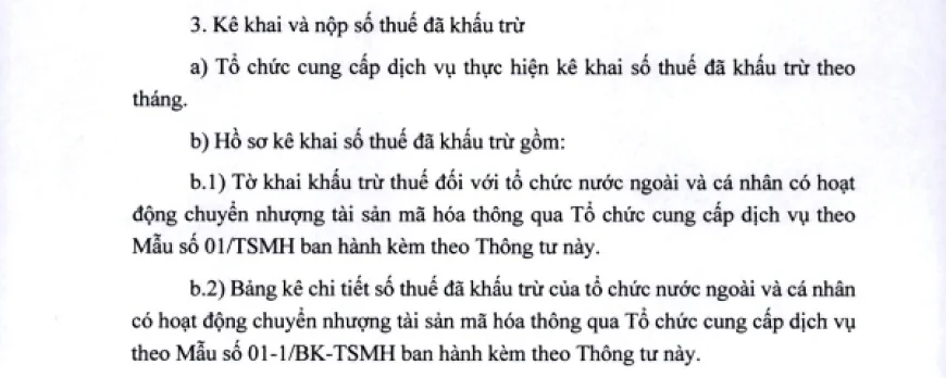 Tổ chức cung cấp dịch vụ tài sản mã hoá có trách nhiệm khấu trừ, nộp thay thuế thu nhập doanh nghiệp đối với tổ chức nước ngoài, và thuế thu nhập cá nhân đối với cá nhân, khi thực hiện giao dịch chuyển nhượng tài sản mã hóa qua hệ thống của mình...