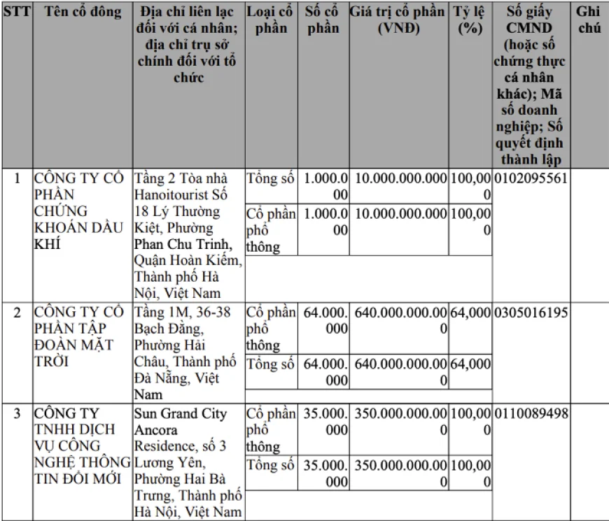 Công ty có vốn điều lệ ban đầu 1.000 tỷ đồng. Trong đó, cổ đông lớn nhất là Công ty cổ phần Tập đoàn Mặt Trời (Sun Group) với tỷ lệ góp vốn 64%, tương đương 640 tỷ đồng. Công ty TNHH Dịch vụ Công nghệ thông tin Đổi mới nắm giữ 35% vốn, trong khi Công ty cổ phần Chứng khoán Dầu khí sở hữu 1% còn lại.