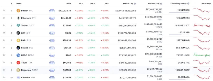 Giá Bitcoin đang giao dịch quanh 102.653 USD, tăng nhẹ 0,47% trong ngày. Các đồng tiền lớn khác cũng ghi nhận sắc xanh, trong đó Ethereum tăng 3,51% lên 3.463 USD, BNB tăng 3,41% lên 996 USD, Solana tăng 3,79% lên 162,87 USD, và XRP tăng mạnh 4,55% lên 2,32 USD.