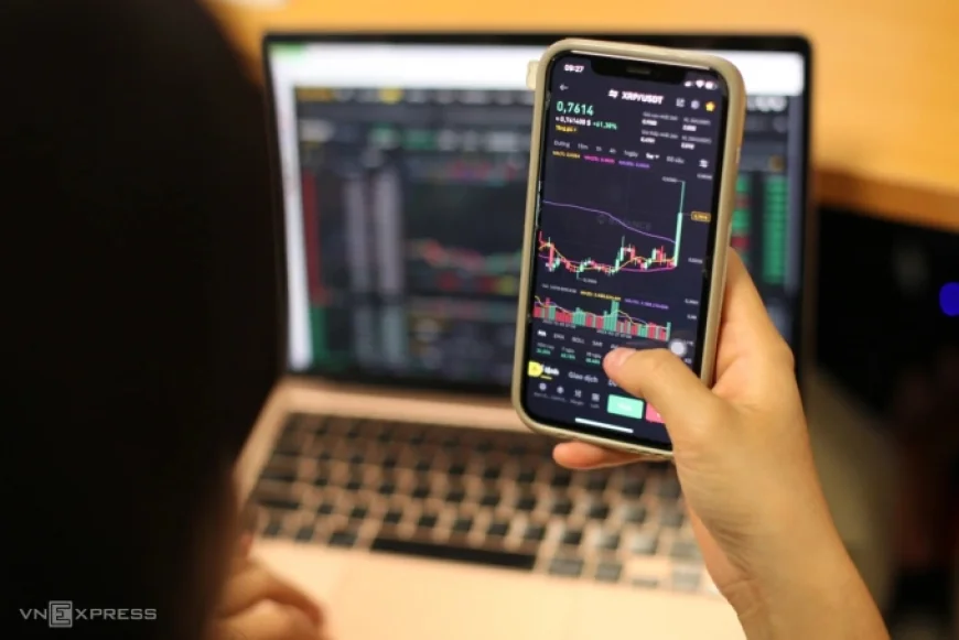 Một nhà đầu tư Việt đang theo dõi biến động giá của tiền mã hóa trên điện thoại. Ảnh: Khương Nha