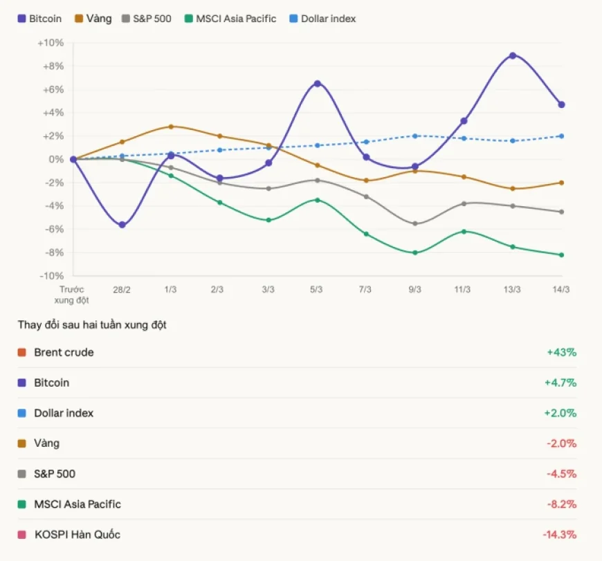 BTC đang neo giá trên 73.800 USD một đơn vị, cải thiện hơn 17% so với đáy ngắn hạn vào thời điểm diễn ra cuộc xung đột. Giá dầu đã tăng hơn 40% kể từ khi xung đột bắt đầu. S&P 500 giảm. Vàng biến động mạnh theo cả hai chiều. Cổ phiếu châu Á có tuần tồi tệ nhất kể từ tháng 3/2020.